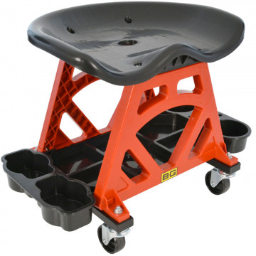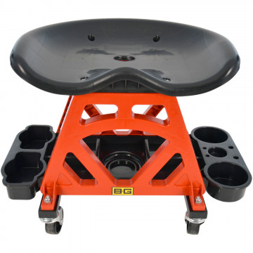 Sedile ergonomico professionale su ruote B-G Racing, progettato per officina e motorsport. Garantisce massimo comfort durante lavori prolungati grazie alla seduta sagomata e offre pratici vani porta attrezzi integrati per avere tutto sempre a portata di mano.