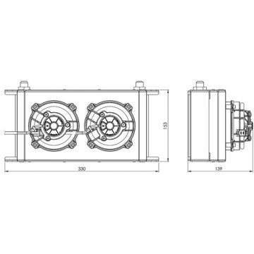 Kit raffreddamento forzato con ventola aspirante per radiatore olio 19 file lungo 235mm (massa radiante) Specifiche tecniche: - Flusso d’aria combinato: 500 m3 / ora (296 cfm) - Peso incluso radiatore olio: 2,49 kg (5,48 libbre) - Altezza pila radiatore olio: 16 file o 19 file - Voltaggio: 12v - Corrente continua: 6.0 - 6.4a - Consumo elettrico: 72 - 76,8 W. - Protezione: certificato IP68 - Costruzione della custodia: alluminio tagliato al laser con resistente finitura a polvere testurizzata Questo articolo è disponibile con una ventola aspirante o soffiante all’interno del kit. RADIATORE FORNITO A PARTE