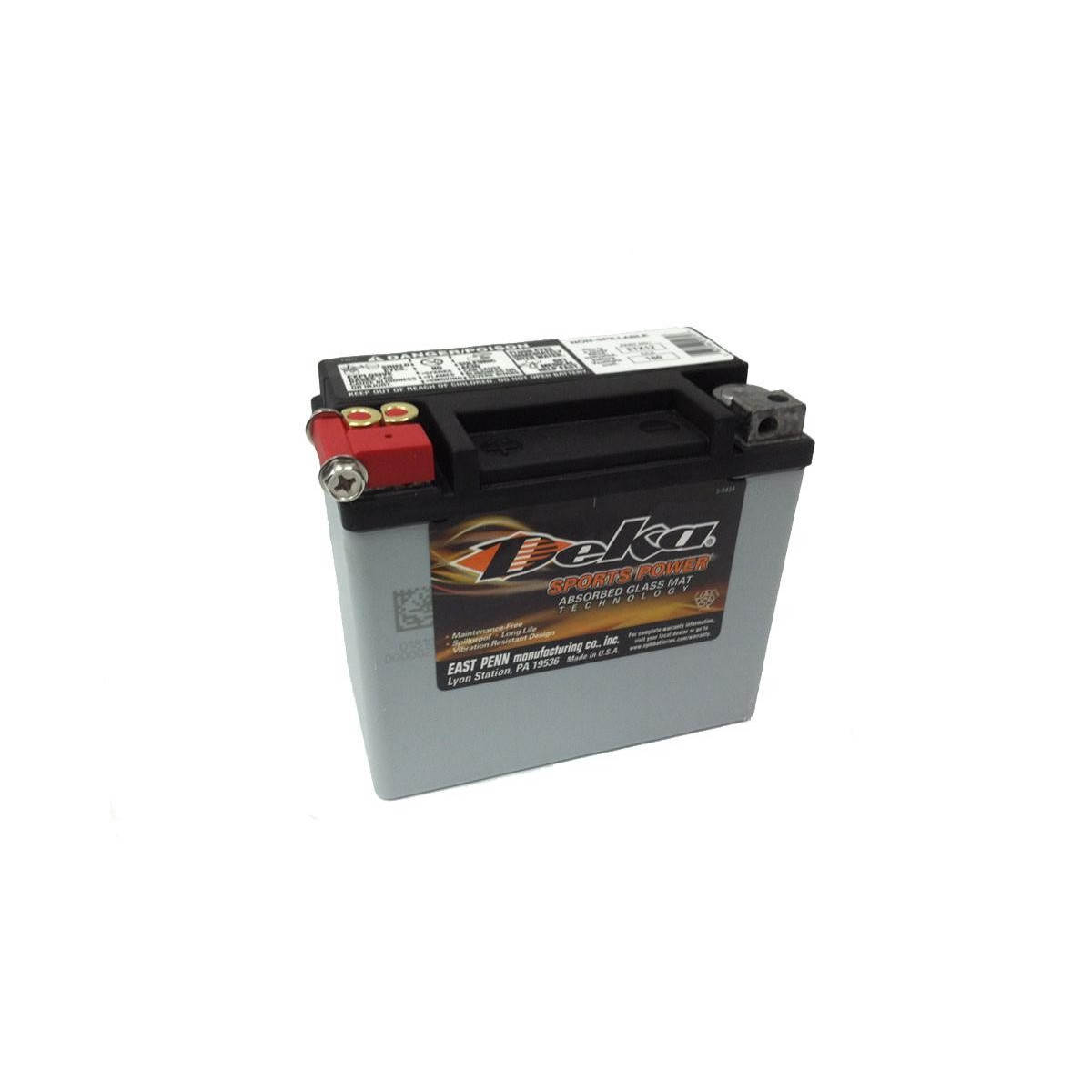 Batteria ermetica DEKA Super Sport a prova di perdita e gocciolamento, senza manutenzione. La batteria, a piombo, usa la tecnologia "Absorbed Glass Mat" (AGM). Dimensioni e peso contenuti. Alte correnti di spunto grazie alla costruzione calcio/calcio. Possono essere installate inclinate anche di 90°. Altissima resistenza alle vibrazioni ed alle sollecitazioni da impatto. Comportamento ottimale a temperature estreme. Recuperabili anche in caso di scarica profonda e accidentale (non utilizzare tensione oltre 14,6 Volts). Ridotta auto-scarica durante i periodi di inattività.