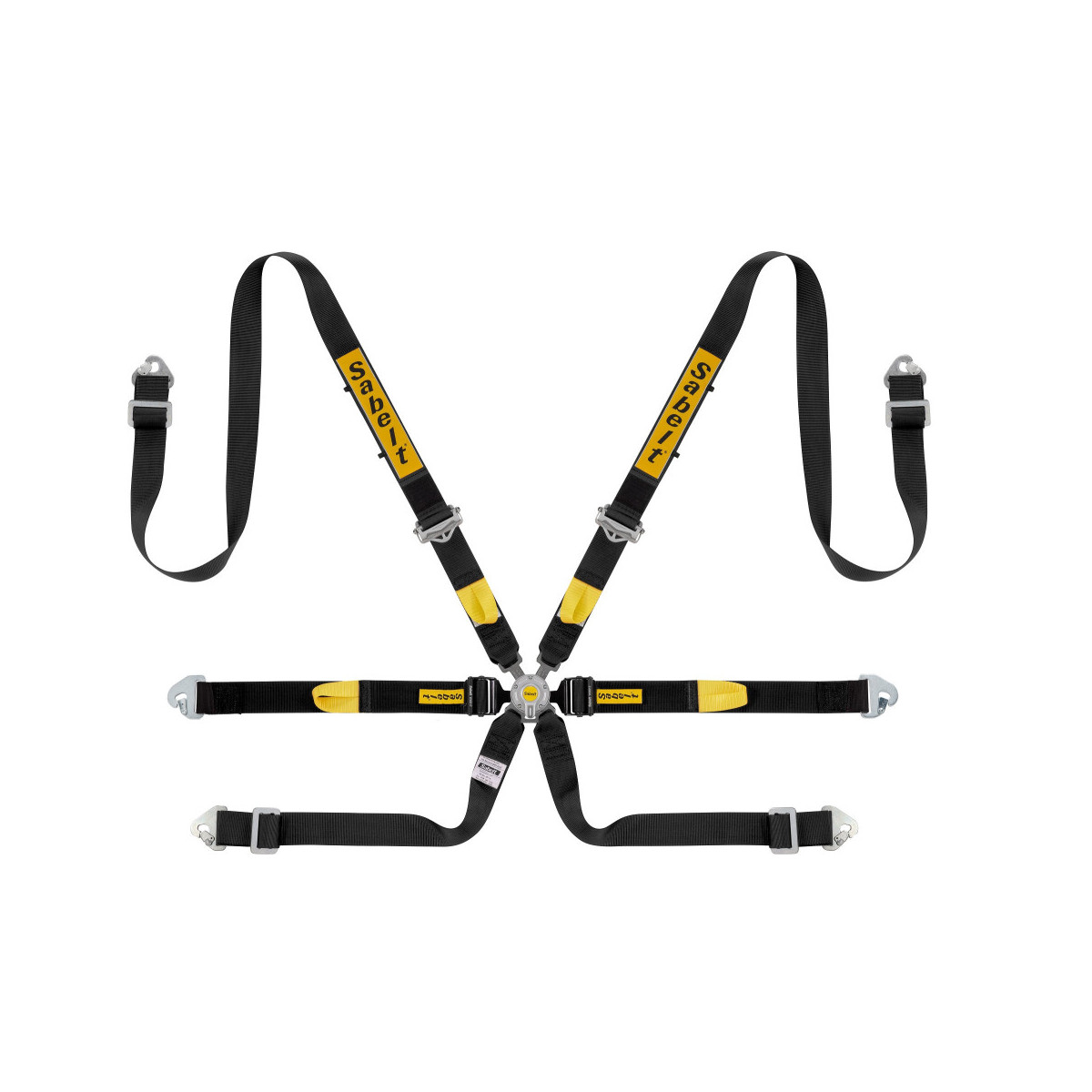 - Bretelle tutta 2’’- regolatore alluminio alleggerito - Fissaggio bretella moschettone – tribar - Addominale tutto 2’’- attacco carabina - Ventrale tutto 2’’- attacco a carabina, sgancio rapido con lingua integrata per vetture GT/Endurance, acciaio-alluminio - Fibbia con predisposizione integrata per cosciale di tipo “T” in alluminio - Cosciali 2’’ attacco moschettone - tribar - Maniglie gialle - Velcro sulle bretelle
