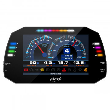 Display extra large TFT 7” ad alto contrasto (1.100 lumen), 8 allarmi LED RGB configurabili, 10 shift light LED RGB configurabili, 2 connettori AMP + 1 connettore Binder, 3 connessioni CAN, connessione a più di 1.000 protocolli ECU del mercato, piattaforma inerziale, 8 canali analogici configurabili, 4 canali velocità digitali, 1 canale RPM, 2 uscite