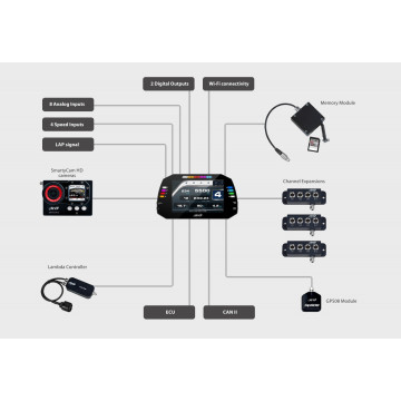 Display extra large TFT 7” ad alto contrasto (1.100 lumen), 8 allarmi LED RGB configurabili, 10 shift light LED RGB configurabili, 2 connettori Motorsport + 1 connettore Binder, 3 connessioni CAN, connessione a più di 1.000 protocolli ECU del mercato, piattaforma inerziale, 8 canali analogici configurabili, 4 canali velocità digitali, 1 canale RPM, 2 uscite digitali, canali matematici completamente configurabili, connessione Wi-Fi 802.11, IP65.