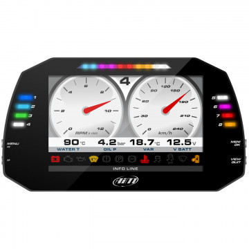 Display TFT 7”, risoluzione 800x480 pixel, contrasto 1000:1, sensore luce ambientale, 8 allarmi LED RGB e 10 shift light LED RGB completamente configurabili, 3 connessioni CAN, collegamento a oltre 2.000 centraline di serie e aftermarket, 8 input analogici/digitali configurabili, 1 input digitale velocità, 1 input RPM, 1 digital output, chassis in alluminio anodizzato, pulsanti metallici, 2 connettori AMP + 1 connettore Binder, IP67.