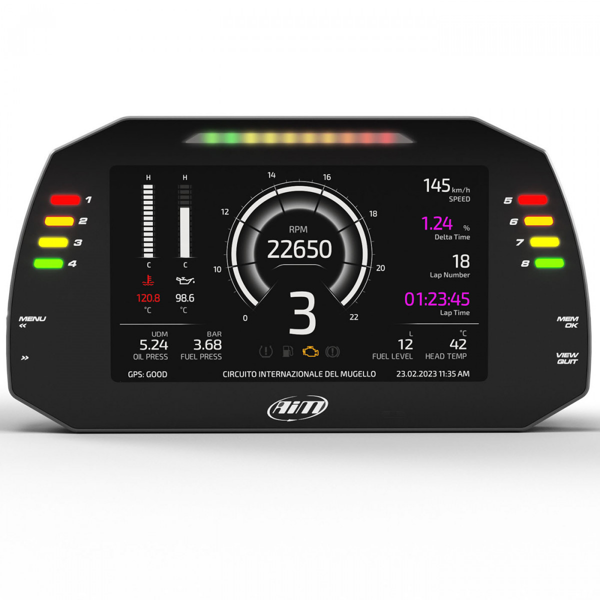 Display TFT 5”, risoluzione 800x480 pixel, contrasto 600:1, sensore luce ambientale, 6 allarmi LED RGB e 10 shift light LED RGB completamente configurabili, 2 connessioni CAN, connessione CAN o K-Line a oltre 1.000 centraline di serie e aftermarket, 4 input analogici configurabili (max 500 Hz ognuno), 1 input video Ext PAL-NTSC, secondo CAN, chassis in alluminio anodizzato, pulsanti metallici, 1 connettore AMP + 1 connettore Binder, IP67.