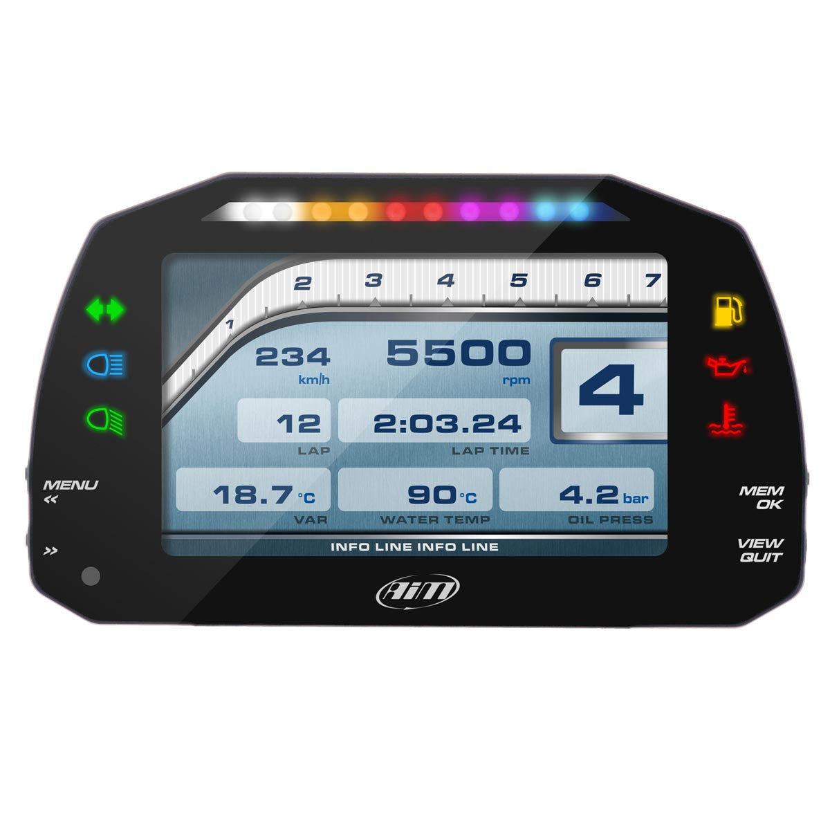 Display TFT 5”, risoluzione 800x480, contrasto 600:1, sensore luce ambientale, 6 allarmi LED RGB e 10 shift light LED RGB completamente configurabili, 2 connessioni CAN, collegamento a oltre 1.000 centraline di serie e aftermarket, 4 input analogici configurabili, 1 input digitale velocità, 1 input RPM, 1 digital output, chassis in alluminio anodizzato, pulsanti metallici, 2 connettori AMP + 1 connettore Binder, IP65.