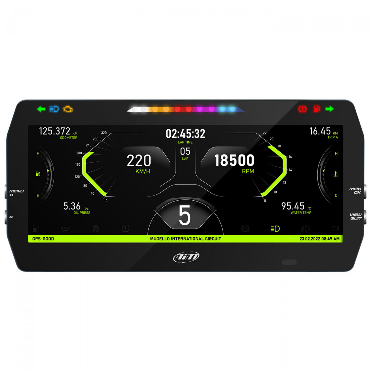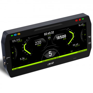 Display TFT 10”, risoluzione 1280x480 pixel, contrasto 1100:1, sensore luce ambientale, 6 allarmi LED RGB e 10 shift light LED RGB completamente configurabili, 3 connessioni CAN, collegamento a oltre 2.000 centraline di serie e aftermarket, 8 input analogici/digitali configurabili, 1 input digitale velocità, 1 input RPM, 1 digital output, chassis in alluminio anodizzato, pulsanti metallici, 2 connettori AMP + 1 connettore Binder, IP67.