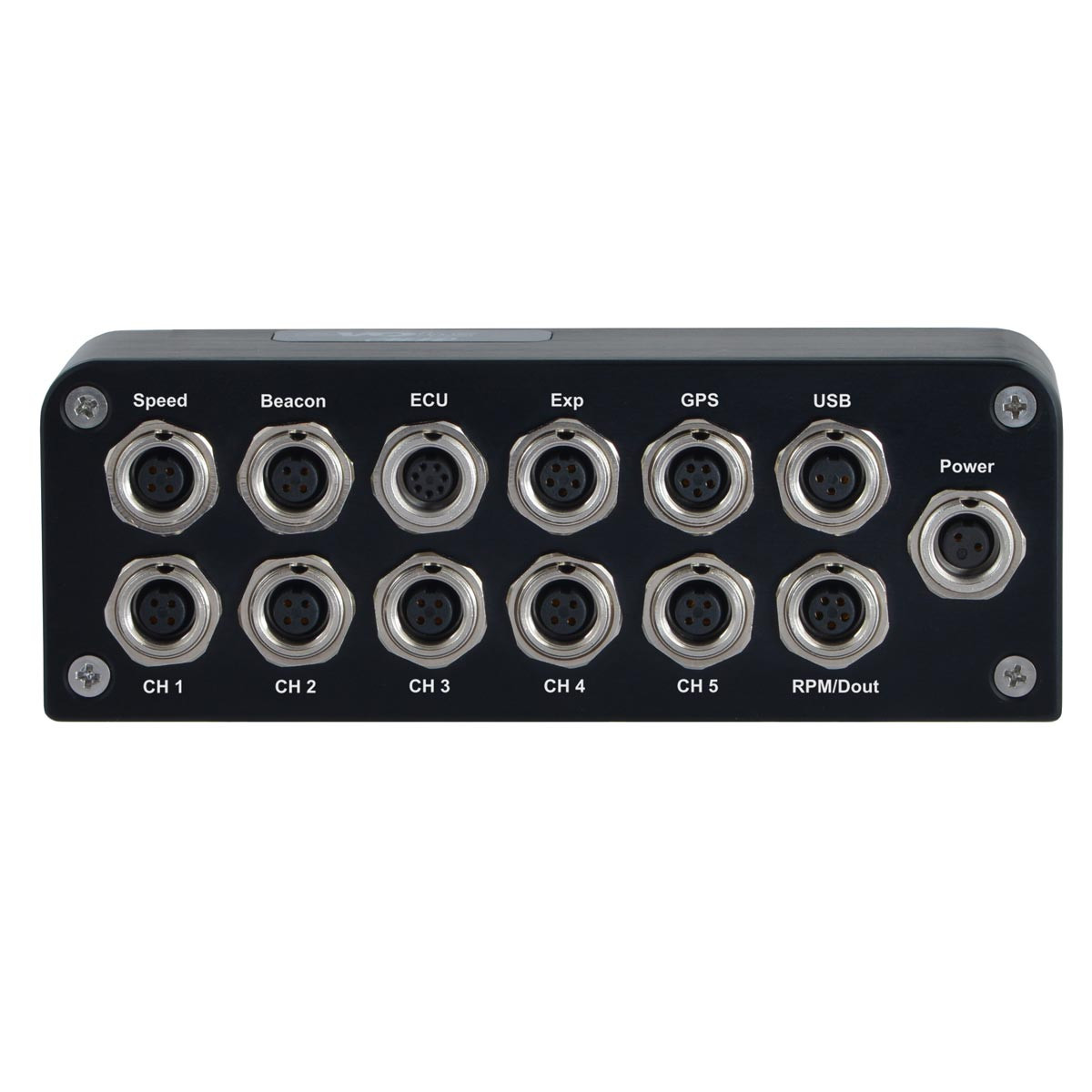 13 connettori Binder, 2 connessioni CAN, collegamento CAN, RS232 o K Line a oltre 1.000 centraline di serie e aftermarket, 5 input analogici configurabili, input digitali (2 velocità, tempo sul giro, RPM), 1 output digitale, accelerometro triassiale ± 5G integrato + giroscopio triassiale, protocollo CAN per moduli di espansione, memoria interna 4 GB, chassis in alluminio anodizzato, IP65.