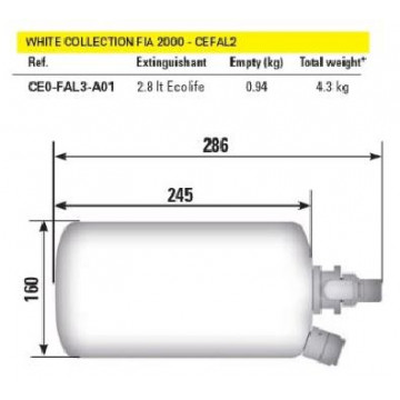 Impianto di estinzione (vano motore e abitacolo) per vetture formula, ad azionamento elettrico, con scatola di controllo, tubi, e ugelli . Bombola in alluminio Ecolife da 2,8 lt. Completo di staffe inox e fascette di fissaggio. Diametro 160mm. Lunghezza 245mm. Peso: 4,3 kg Bombola colore: BIanco (CEFAL2)