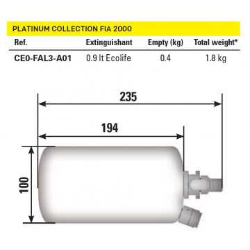 Impianto di estinzione (motore e abitacolo) per vetture formula ad azionamento elettrico, completo di centralina, tubi, raccordi e ugelli . Nuova bombola ultraleggera in alluminio dalle dimensioni ridotte .0,9L di liquido. Completo di staffe in acciaio inox e fascette di fissaggio. Diametro 100mm. Lunghezza 194mm. Bombola colore: Argento (CEFAL3) Peso: 1,8 kg