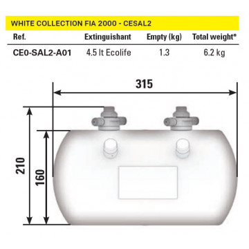 Impianto di estinzione (vano motore e abitacolo) per vetture berlina ad azionamento elettrico, completo di scatola comandi, tubi e ugelli. Bombola in alluminio 4,25 lt Ecolife. Completo di staffe in acciaio inox e fascette di fissaggio. Diametro: 160mm Lunghezza: 315mm Peso: 6,2 kg Bombola colore: Bianco (CESAL2)