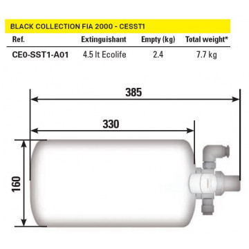 Impianto di estinzione (vano motore e abitacolo) per vetture berlina ad azionamento elettrico con scatola di controllo, tubi e ugelli. Bombola in acciaio .Ecolife da 4,25 lt. Completo di staffe in acciaio inox e fascette di fissaggio. Diametro: 160mm Lunghezza: 330mm Peso: 7,7 kg Bombola colore: Nero (CESST1)