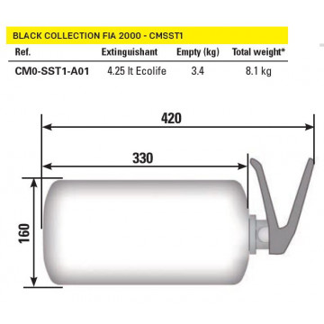 Impianto di estinzione (vano motore e abitacolo) per vetture berlina ad azionamento meccanico, con tubi e ugelli. Completo di staffe in acciaio inox e fascette di fissaggio. Ecolife da 4,25 lt. Diametro: 160mm Lunghezza: 330mm Peso: 8,1 kg Bombola colore: Nero (CMSST1)