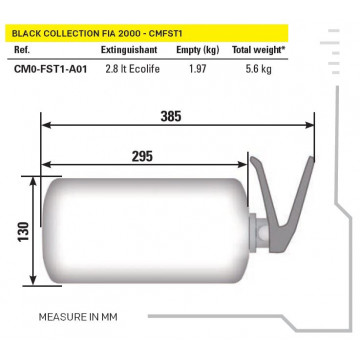 Impianto di estinzione (motore e abitacolo) per vetture formula, a comando meccanico completo di tubi, raccordi ugelli erogatori. Bombola in acciaio. 2,8 lt di Ecolife. Completo di staffe inox e fascette per il montaggio. Diametro: 130 mm. Lunghezza: 330 mm Peso: 5,6 kg