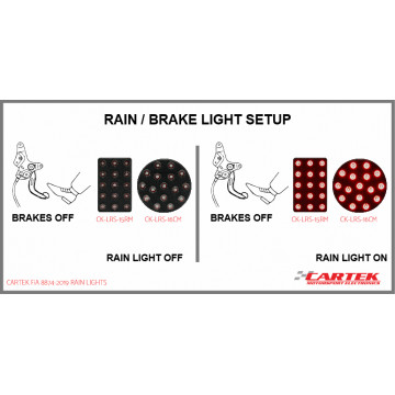 Omologate secondo le ultime normative FIA 8874-2019, queste ultime luci da pioggia possono essere utilizzate in modalità statica o lampeggiante a 4Hz.La nuova generazione di Cartek Rain Light è 3 volte più luminosa della precedente e viene fornita con un cavo mil-spec da 190 mm (cablaggio Type55 22awg).