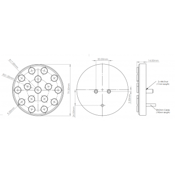 Le luci della pioggia sono conformi a IP65 e possono anche essere cablate come luci multiuso per pioggia/freno.SPECIFICATION- Dimensioni: Diametro = 79.5mm, Spessore = 14mm- Peso: 120gr- Tensione di lavoro (Volts): 11.3v - 15.6v- Assorbimento: 700mA @ 12.5V- Temperatura di esercizio: -10 / +105 degrees C- Materiale: Pezzo singolo di resina stampata (IP65)- Connessione: 190mm Mil-Spec Flying lead (Type 55 22awg wire)