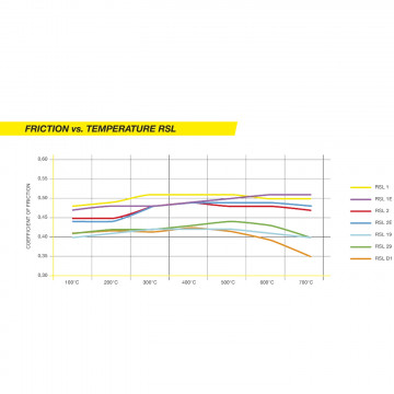 La mescola RSL 19 mantiene un livello di attrito costante in un'ampia gamma di temperature. Il materiale presenta ottime caratteristiche di modulazione e rilascio.