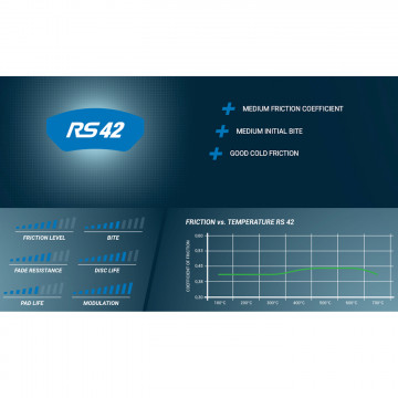 La mescola RS42 offre un coefficiente di attrito medio, un bite iniziale medio ma contemporaneamente un' ottima modulabilità, una durata del disco e durata della pastiglia.