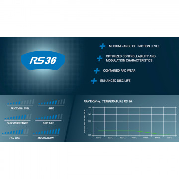 La mescola PAGID Racing RS 36 è una mescola sviluppata specificamente per monoposto e monoposto con un notevole carico aerodinamico. La caratteristica forma della sua curva di attrito contribuisce alla modulazione, proteggendo al contempo il disco.