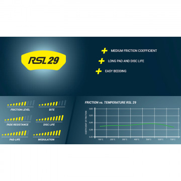 RSL 29 presenta ottime caratteristiche di modulazione e rilascio. È un materiale incollato in resina metallica bassa contenente fibre di acciaio e aramide. Il livello di attrito del materiale è costante.