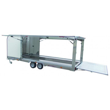 • rimorchio basculante idraulico • piano di carico a guide di alluminio sagomato antiscivolo • argano meccanico • pedana di carico in alluminio di grosso spessore • pareti in vetroresina coibentata • fiancata laterale dx/sx apribile verso l'alto • porta laterale d'ispezione • freno a repulsione meccanica con sblocco autoreverse per retromarcia • sospensione a barra di torsione su gomma a ruote indipendenti • telaio tubolare profilato di grosso spessore zincato a caldo • impianto luci a nuova normativa comprensivo di retromarcia • ruotino di stazionamento zincato a caldo con cuscinetto per minimo sforzo in alzata