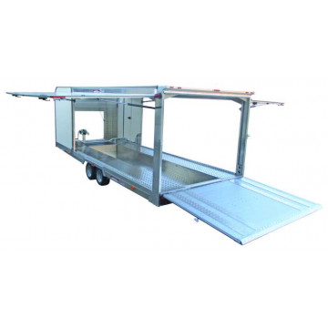 • rimorchio basculante idraulico • piano di carico a guide di alluminio sagomato antiscivolo • argano meccanico • pedana di carico in alluminio di grosso spessore • pareti in vetroresina coibentata • fiancata laterale dx/sx apribile verso l'alto • porta laterale d'ispezione • freno a repulsione meccanica con sblocco autoreverse per retromarcia • sospensione a barra di torsione su gomma a ruote indipendenti • telaio tubolare profilato di grosso spessore zincato a caldo • impianto luci a nuova normativa comprensivo di retromarcia • ruotino di stazionamento zincato a caldo con cuscinetto per minimo sforzo in alzata