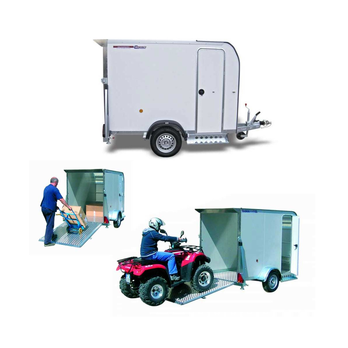 Carrello Cresci Serie 650F. I piani di carico sono realizzati in alluminio, resistenti ed antiscivolo. Possibilità di ispezionare l'interno, delimitato da pareti in alluminio coibentato, tramite porta laterale. Sono montate sospensioni a barra di torsione a ruote indipendenti. Il telaio è realizzato con profilati di lamiera di grosso spessore, zincati a caldo. Il carrello dispone di un impianto luci a nuova normativa comprensivo di retromarcia. Può essere stazionato mediante piedini posteriori. Specifiche tecniche: - Dimensioni vano carico (cm): 250x130x170 - Altezza piano di carico: 40cm - Lunghezza massima: 381cm - Larghezza massima: 180cm - Altezza massima: 210cm - Massa a pieno carico: 600kg - Portata utile: 210kg - Ruote: 155 R13