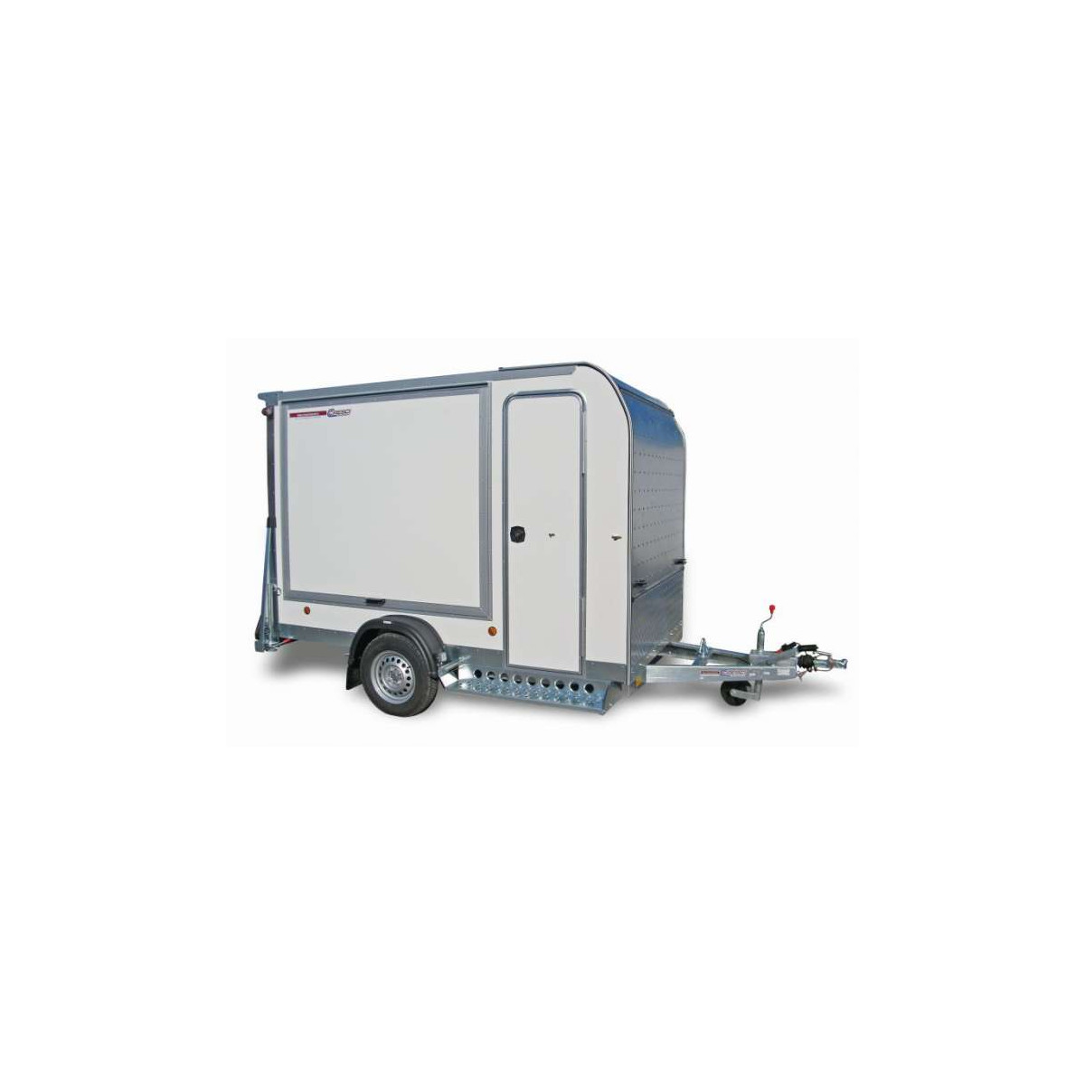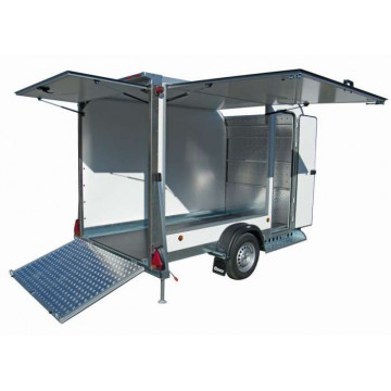 • piano di carico in multistrato marino antiscivolo • robusta rampa di carico in alluminio antiscivolo • pareti in alluminio coibentato • fiancata laterale dx apribile verso l'alto • porta laterale d'ispezione • freno a repulsione meccanica con sblocco autoreverse per retromarcia • sospensione a barra di torsione su gomma a ruote indipendenti • telaio profilato di lamiera grosso spessore zincata a caldo • ruote di grande diametro di tipo automobilistico • impianto luci a nuova normativa comprensivo di retromarcia • ruotino di stazionamento zincato a caldo con cuscinetto per minimo sforzo in alzata • piedini posteriori di stazionamento