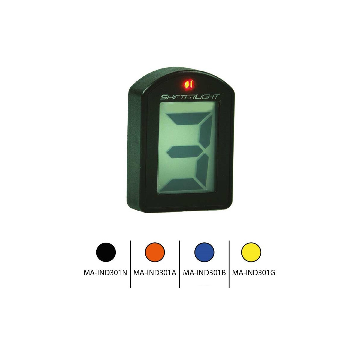 Indicatore digitale di marcia, con autoapprendimento a mezzo set/up. Dispositivo per contachilometri e contagiri elettronici e contachilometri meccanico. Alimentazione 12V con retroilluminazione e flash di cambiata.