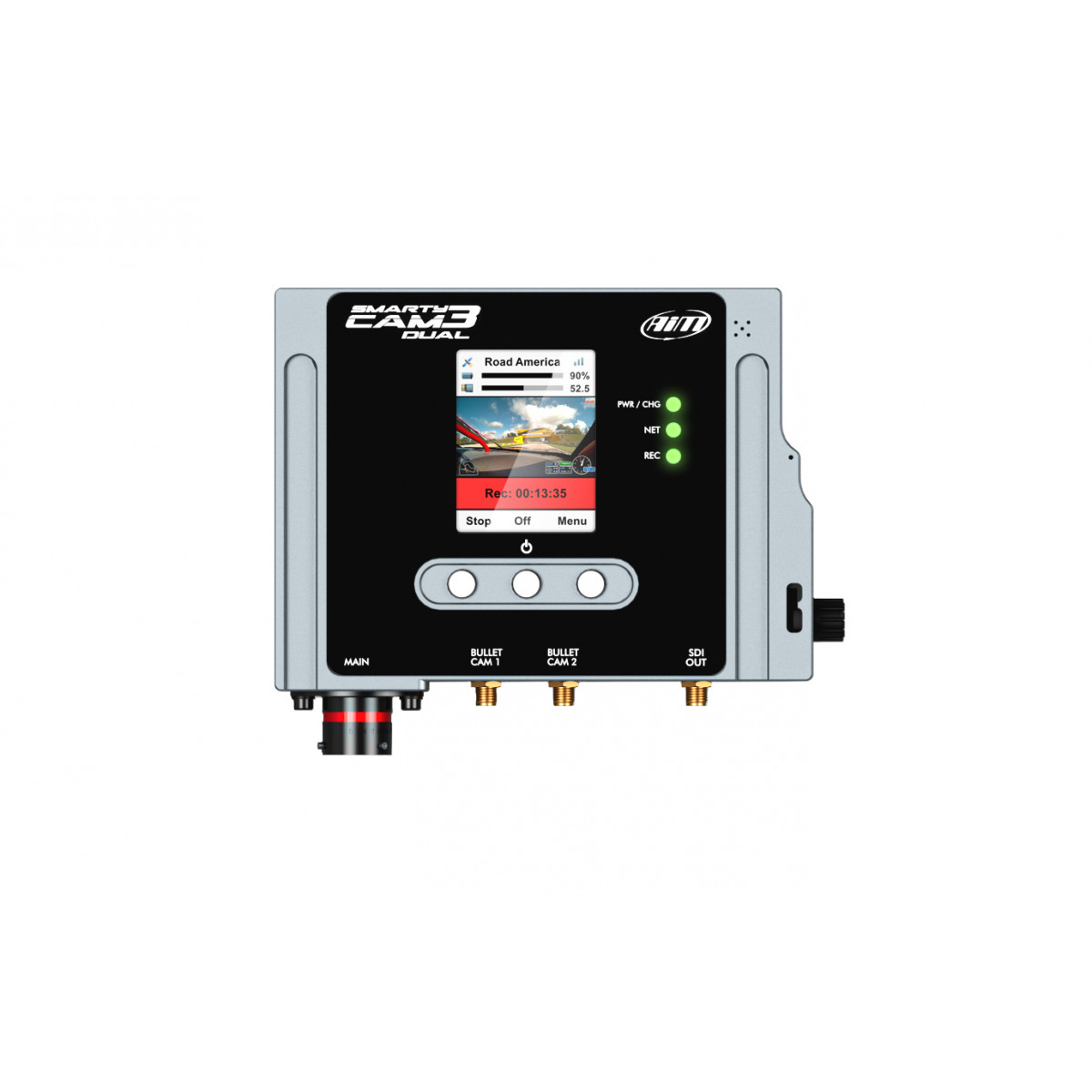 La nuovissima telecamera progettata per gli sport motoristici con due telecamere bullet. Registrazione di video con sovrapposizione di dati in tempo reale, bullet cam con obiettivo della fotocamera a bassa distorsione, obiettivo da 67°, 84° o 120°, CMOS Global shutter, start&stop automatico, dimensioni unità principale 154,4 x 109,6 x 42 mm, risoluzione display 240x320 pixel, peso dell'unità principale 800 g, formato video H.264 1920 x1080 pixel @ 60 fps, alimentazione esterna 9-15 Volt, archiviazione file su SD scheda fino a 2 TB (non inclusa), impermeabile IP65.
