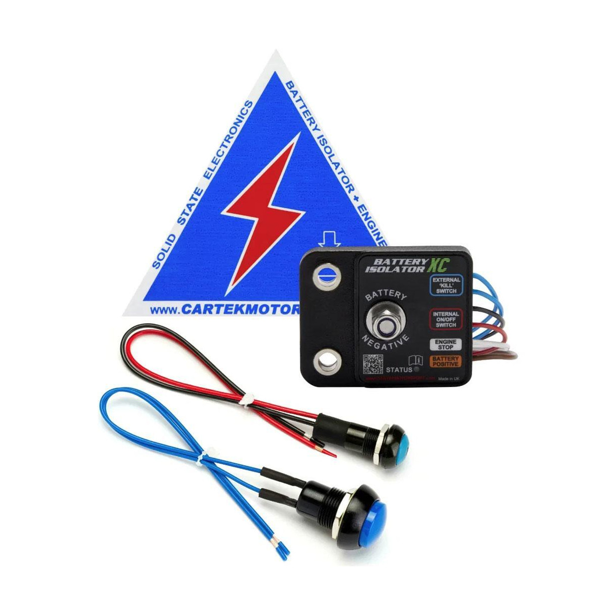 Kit staccabatteria Cartek mod. X-Club con pulsante esterno blu Lo staccabatteria CARTEK X-Club è stato progettato come un?opzione economica ed efficace, ottimizzata per auto da corsa e rally con motori derivati dalla produzione, stock o leggermente elaborati, fino a 3 litri di cilindrata e massimo 6 cilindri.