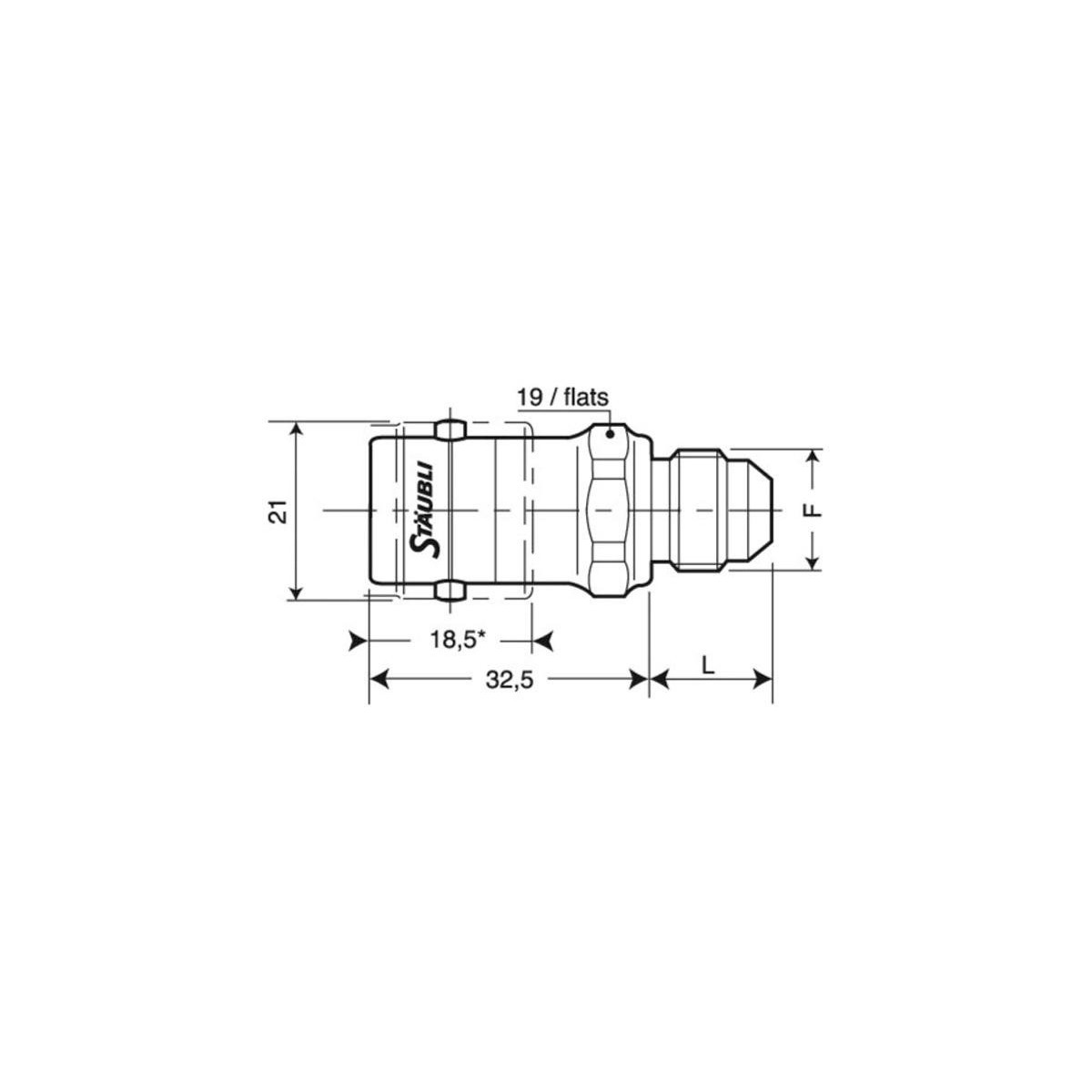 Valvola Staubli maschio UNF 7/16x20 - Utilizzo: Benzina, azoto, oli e grassi minerali - Materiale: Alluminio - Nominale: 05 mm - Sezione trasversale: 19,6 mm2 - Misura L: 14 mm - Peso maschio + femmina: 33,5 gr - Pressione lavoro max: 160 bar - Colore: Rosso - Chiusura: Doppia